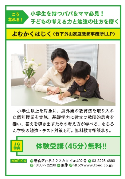 この個別指導塾「よむかくはじく」は新宿区四谷にございます。ここ四谷〜新宿御苑エリアの街の情報をあつかうのが、タウン誌「JG」です。これまでずっと、いち読者として毎号楽しみにながめていましたが…ついに、JGの表紙に私たちも登場することに!JGのみなさま、ありがとうございました。こちらが最新号の3月号の表紙、掲載ページです。